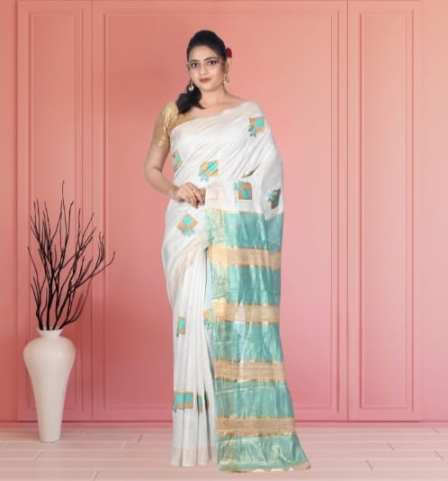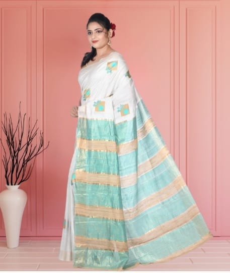 This exquisite saree features full-body embroidery on a luxurious white Katan by Tussar silk, blending traditional artistry with elegant texture. The rich Gheecha anchal adds an authentic touch, enhanced by a finely woven zari border that elevates the saree’s sophistication. Ideal for ceremonial occasions, this handcrafted piece delivers both visual appeal and a regal drape, showcasing premium craftsmanship rooted in heritage textile techniques.