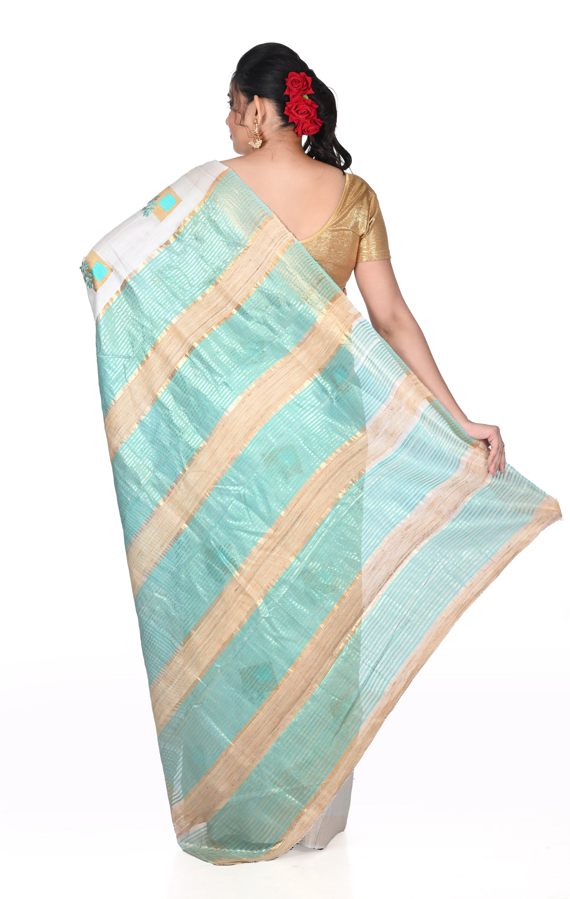 Full Body Embroidery Work on White Katan by Tussar Silk Saree with Gheecha anchal and Zari Border