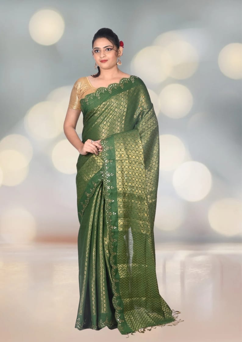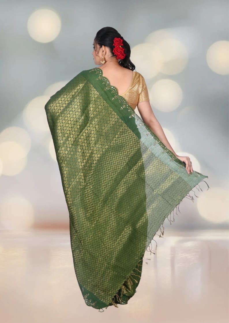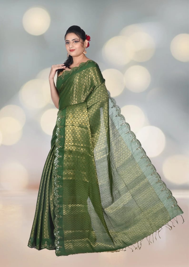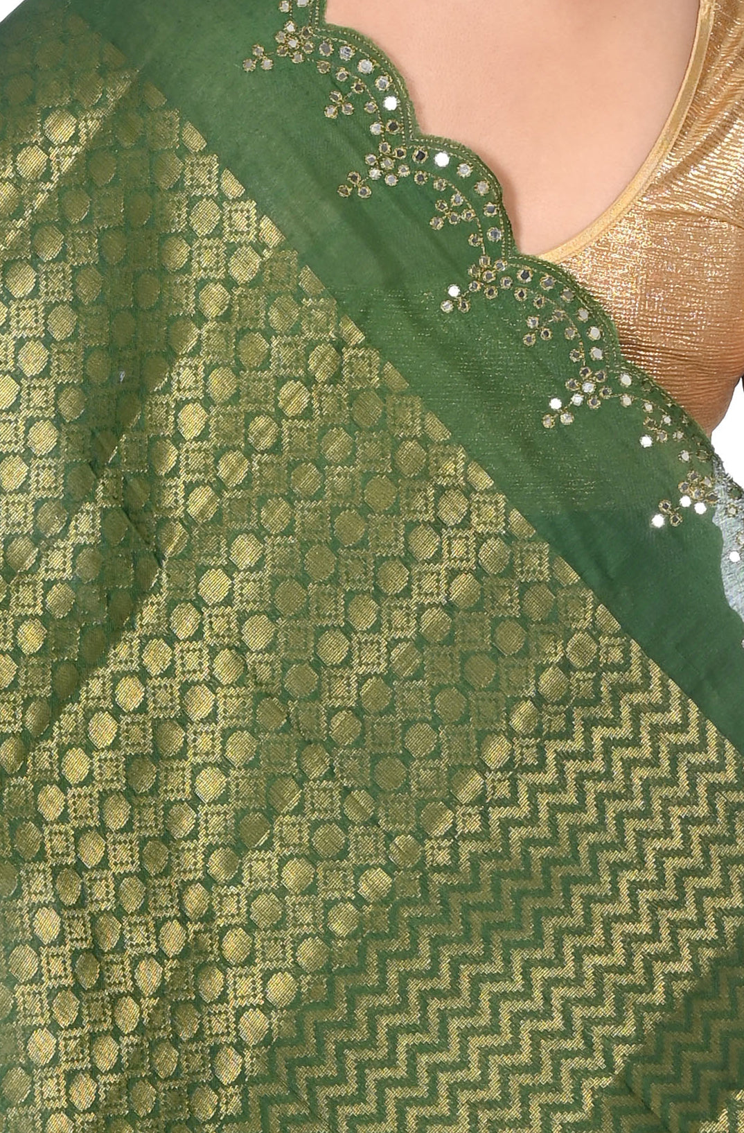 Green Colour Brocade Katan Silk Saree with Mirror Work in the Border