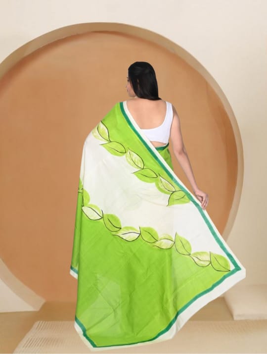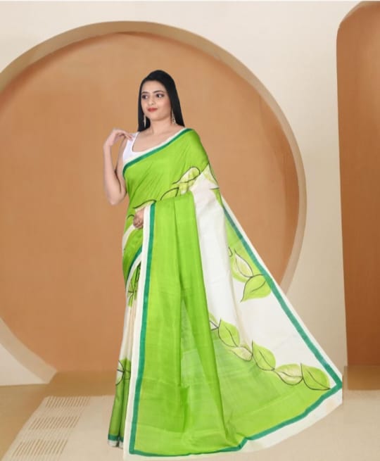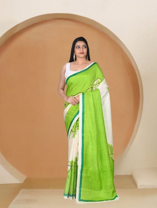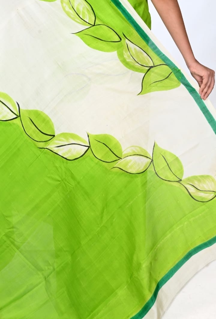 Off White and Green Colour Hand Brush Painted Mulberry Katan Silk