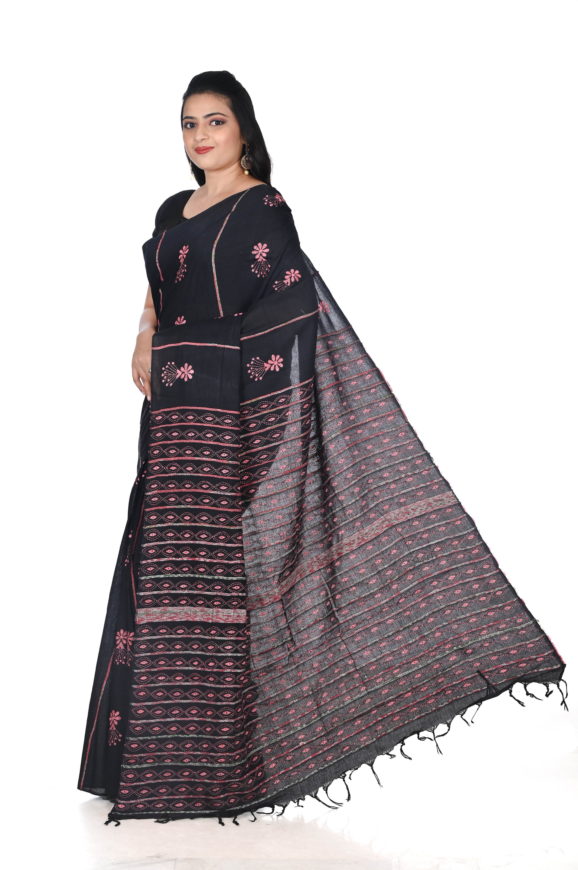 Pink Colour Hand Kantha Embroidery Work on Black Khadi Cotton Saree