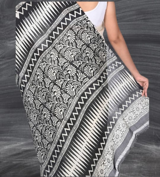 White and Black Hand Block Printed Mulberry Silk Katan
