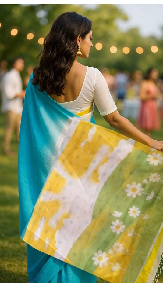White and Blue Linen with Printed Anchal